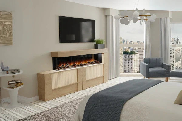 Dynamic Flame Effect: Features realistic flames with tumbled glass media and rhythmic logs for a sophisticated and modern appearance.