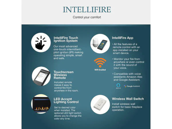 - IntelliFire® Touch Ignition: Choose your preferred control method—touchscreen remote, wireless wall switch, or IntelliFire® mobile app.