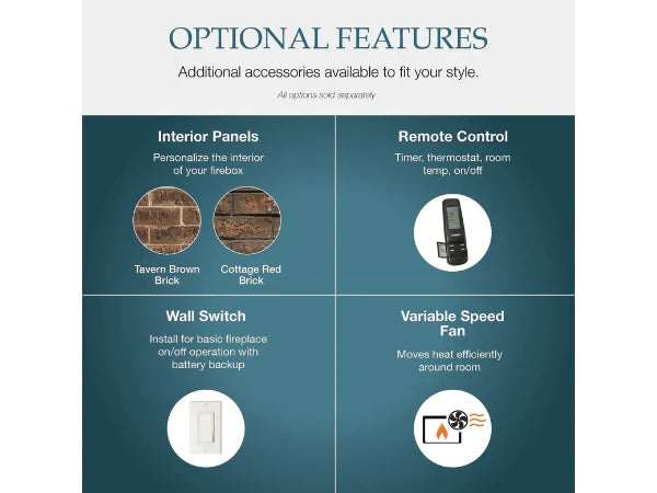 - Optional Remote or Wall Switch Control – Customize your fireplace experience
